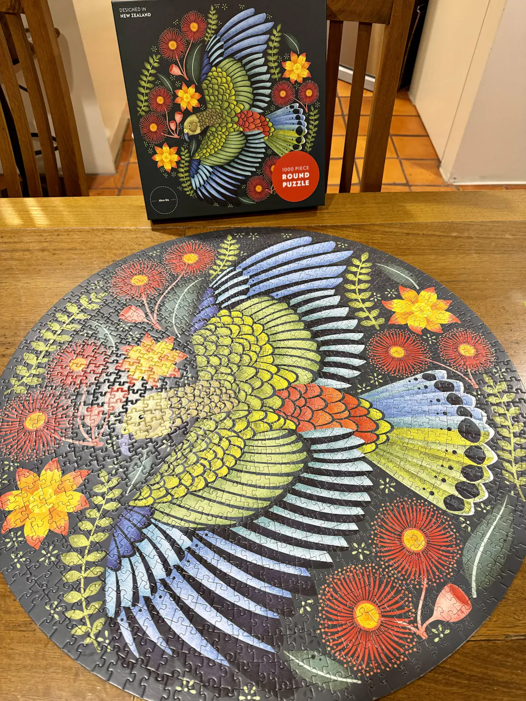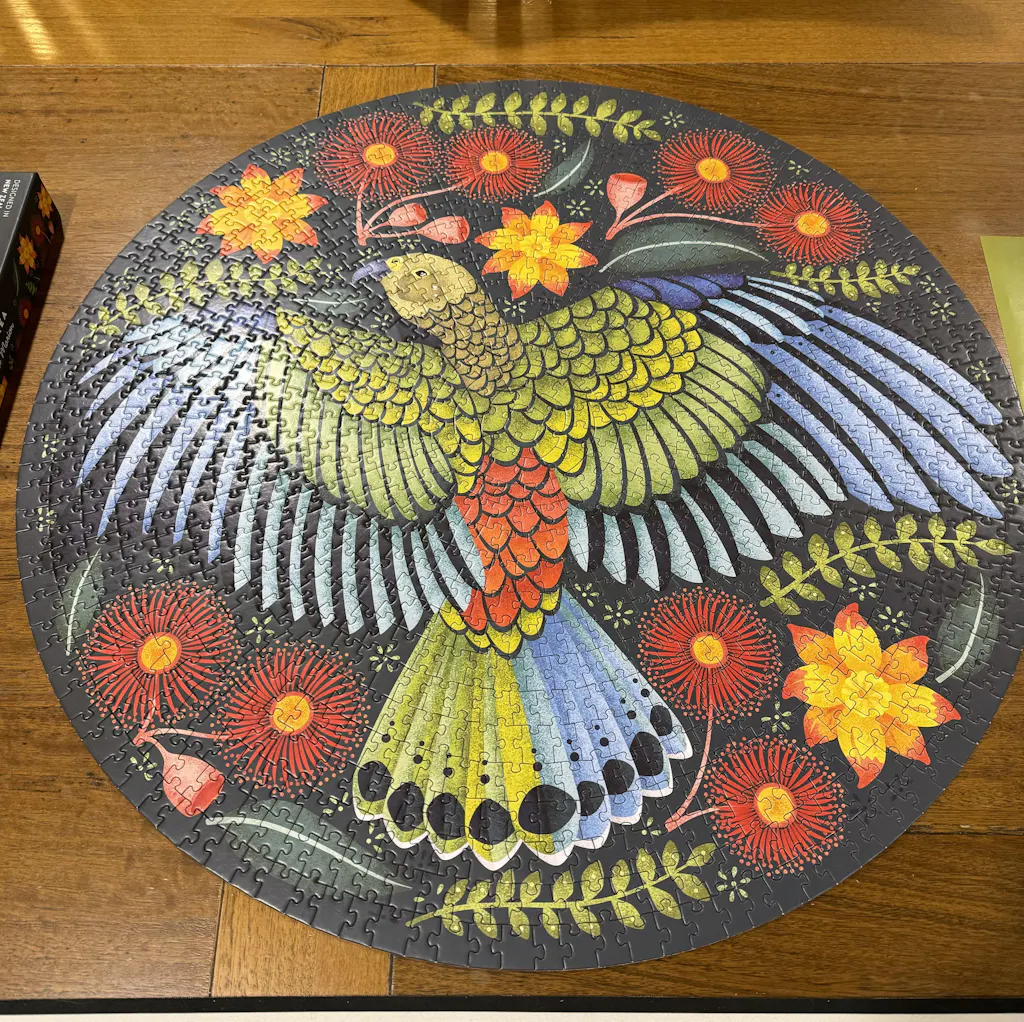 This 1000 piece round jigsaw puzzle features the richly coloured Folklore & Fauna illustration of the Cheeky Kea by Catherine Marion.