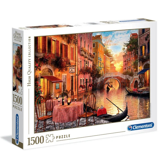 Embark on a romantic journey through Venice with Clementoni's 1500-Piece Puzzle: Venezia. Delight in the charming scene of cafe tables lining the banks of a picturesque canal, with a gondolier gracefully passing under a quaint bridge against the backdrop of a breathtaking sunset.