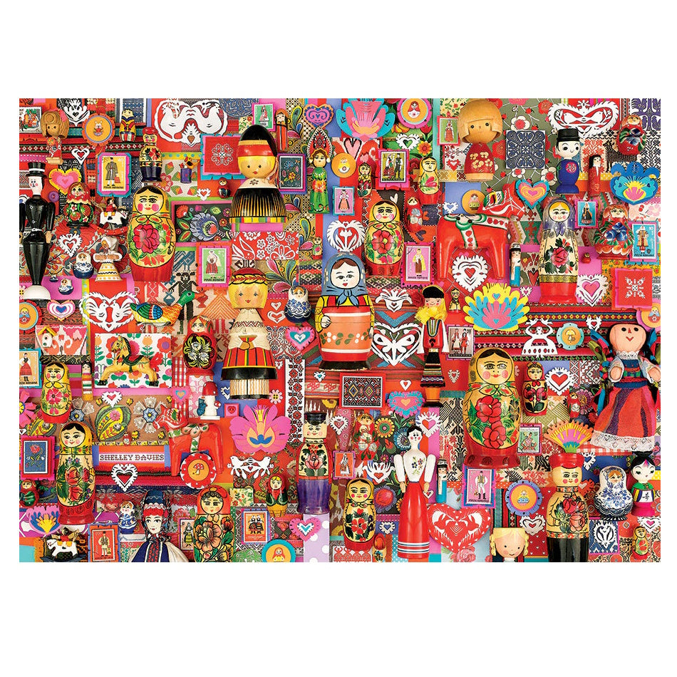 Step into a vibrant world of culture and tradition with Dollies, a stunning collage handmade by artist Shelley Davies. This international assemblage of dolls is bursting with rich history, intricate patterns, and colourful charm. A delightful challenge for puzzlers and a celebration of artistry from around the globe.