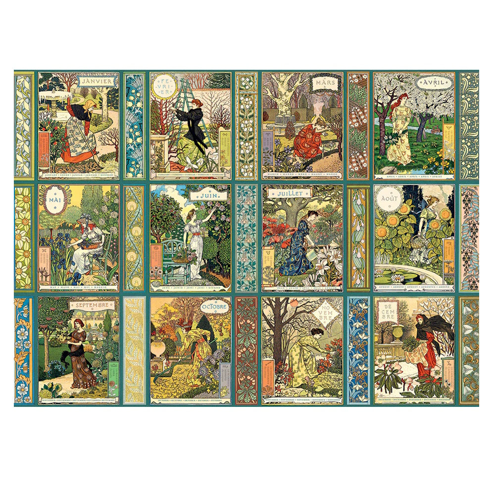 Jardiniere: A Gardener's Calendar beautifully illustrates the work of Eugene Grasset, a pioneer of Art Nouveau design. This 1000 piece collage puzzle from Cobble Hill immerses the puzzler into 12 intricate gardening scenes by month, headlined in French.