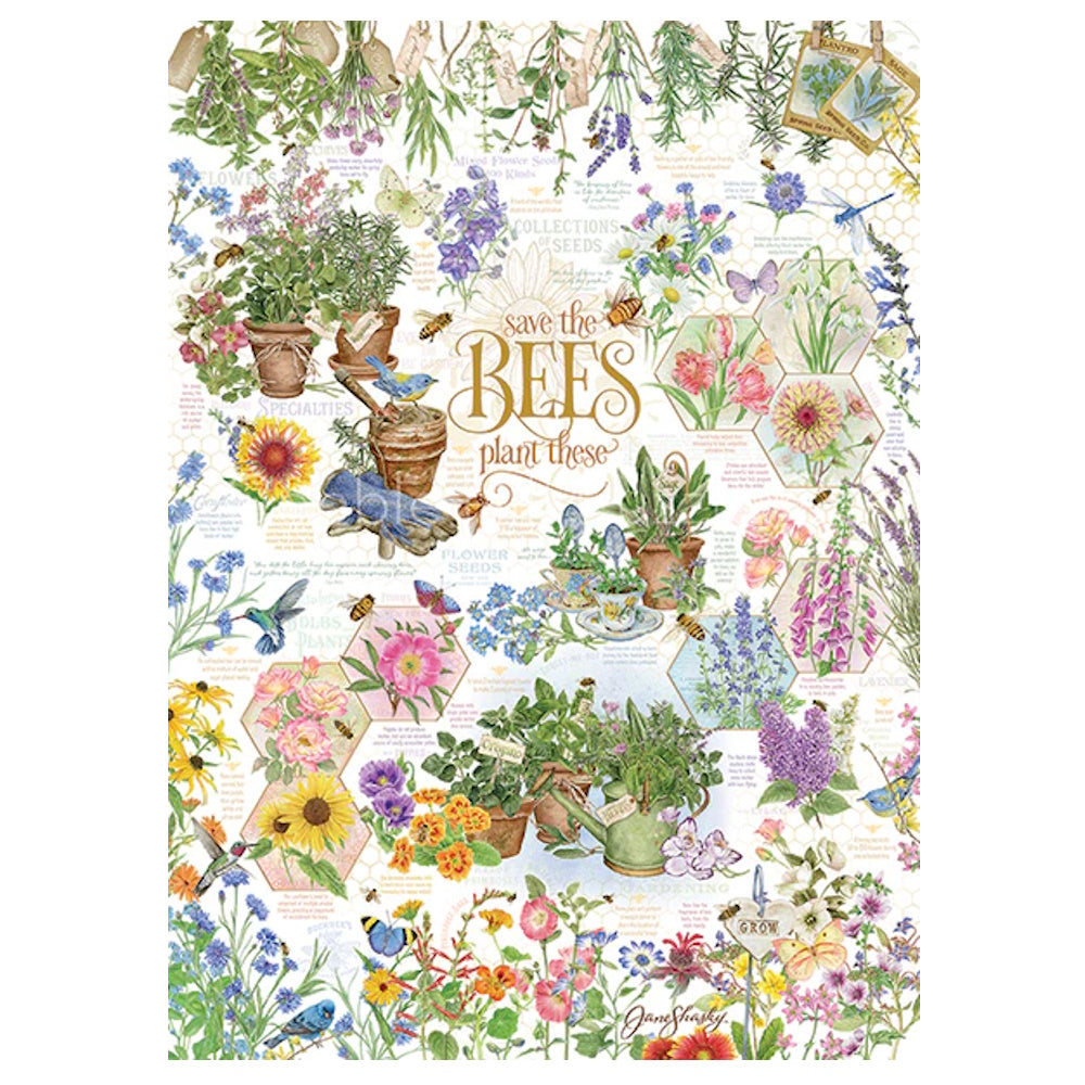 Our little buzzing buddies are looking bee-utiful in this 1000 piece jigsaw puzzle featuring fun facts and bee-friendly flowers! Delightfully illustrated by Jane Shasky.