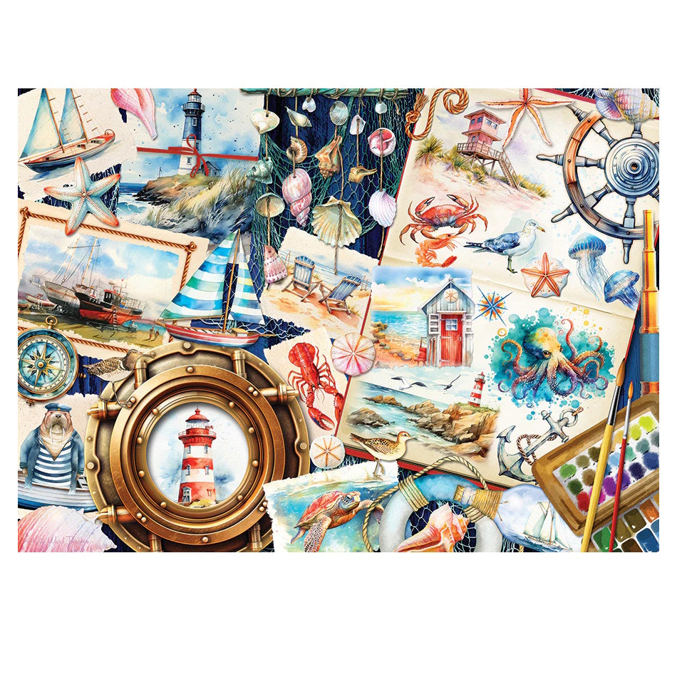 Seashore Sketchbook brings maritime charm to life with delightful watercolour illustrations of sea creatures. From crabs, lobsters, and octopuses to sea turtles, jellyfish, and an adorable walrus dressed as a sailor, this 1000 piece puzzle is brimming with coastal whimsy! Adorned with seashells and ships, it offers a playful glimpse into life by the lighthouse.