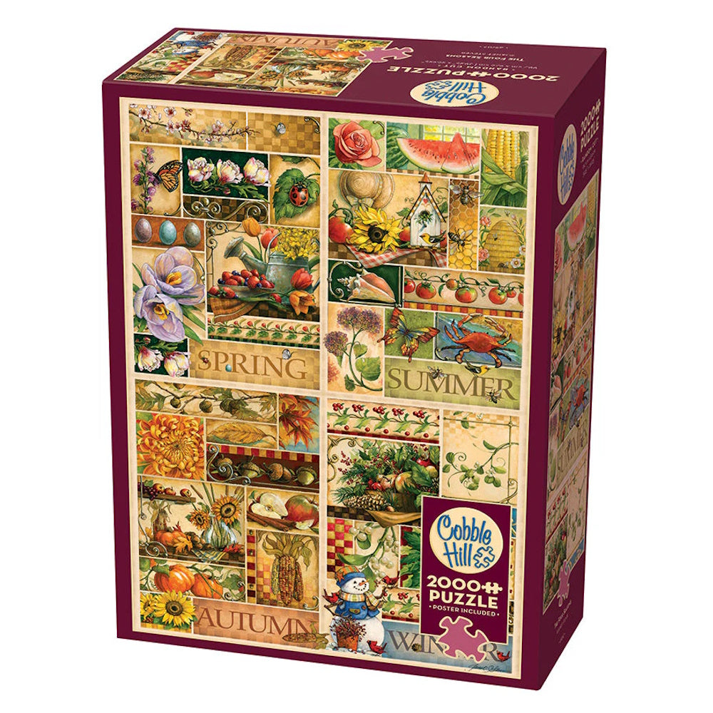 Experience the charm of nature’s cycle with Cobble Hill's 2000 Piece Puzzle "The Four Seasons." Featuring Janet Stever’s beautiful artwork, this collage highlights four panels, each showcasing seasonal produce and vibrant illustrations for spring, summer, autumn, and winter.