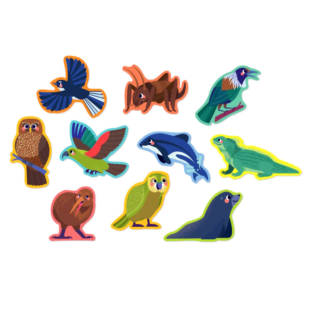 The set includes 10 colourful 2-piece puzzles featuring New Zealand animals including the Kiwi, Morepork, Tui, Tuatara and more. The extra large puzzle piece are perfectly sized for little hands, and each puzzle measures approximately 10cm x 15cm when completed.