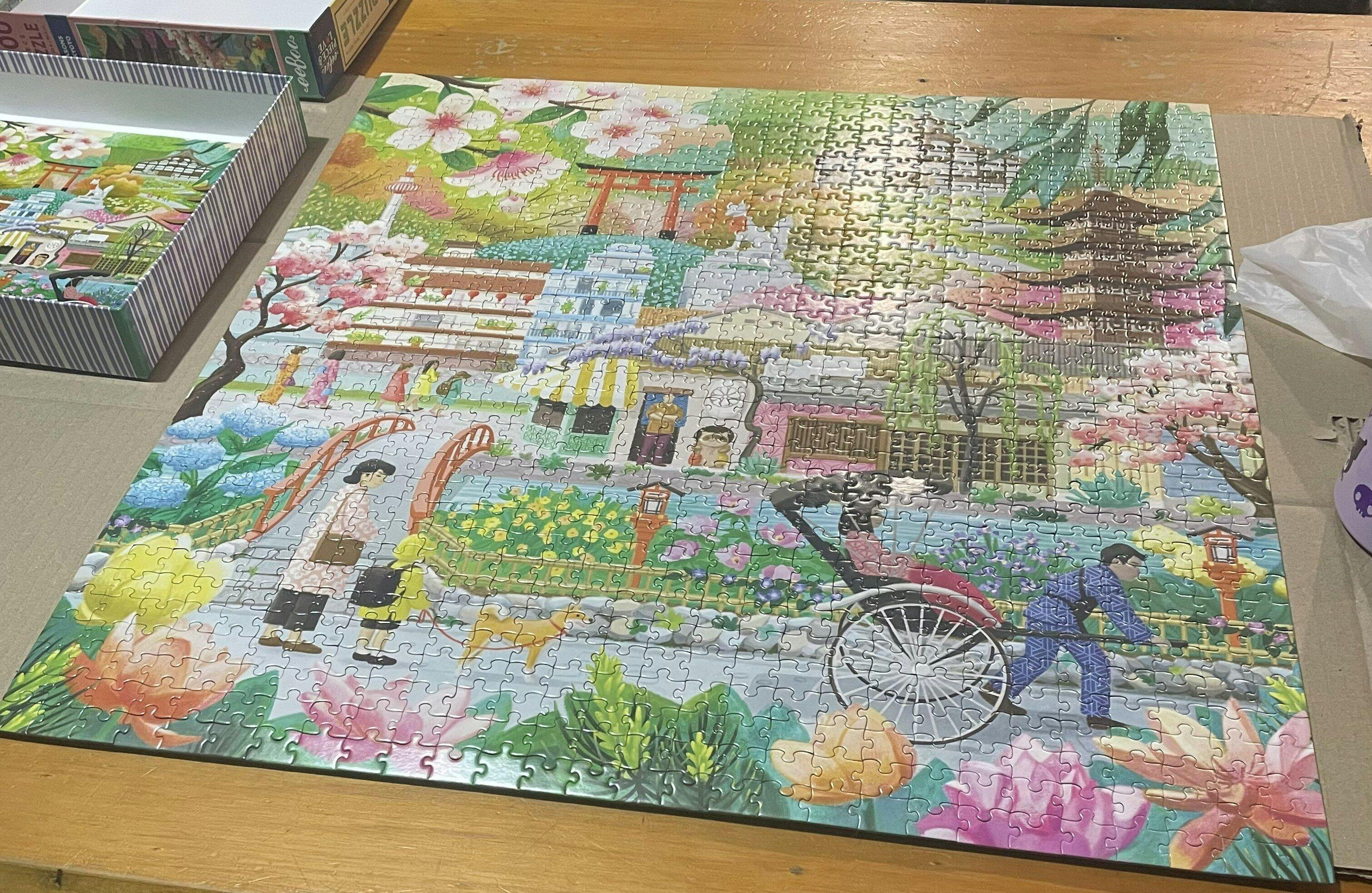 Journey through the beauty of Japan with Seasons in Kyoto, a stunning 1000-piece puzzle illustrated by Jennifer Potter. This vibrant scene blends the essence of Kyoto’s seasons—blossoming cherry trees, autumn foliage, serene temples, and lively streets—into one richly detailed celebration of tradition and nature.