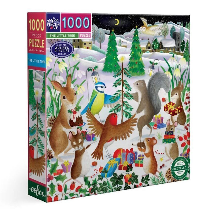 Delight in the whimsical charm of the eeBoo 1000-piece puzzle, The Little Tree. This enchanting puzzle depicts a snowy Christmas scene where forest animals bearing gifts gather around a little pine tree.