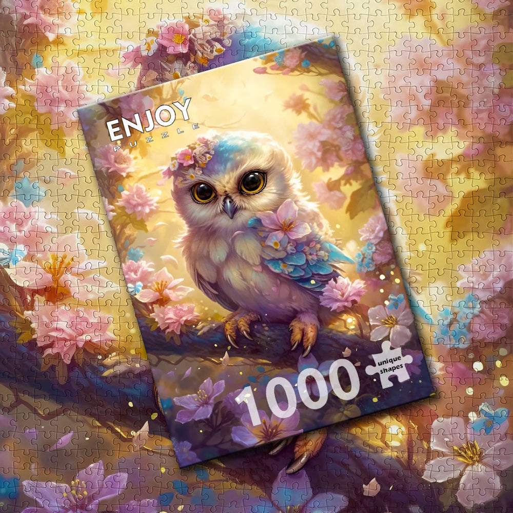 Step into a dreamy woodland scene with Gentle Owl, a captivating 1000-piece puzzle that blends fantasy and nature. Featuring a wide-eyed owl adorned with delicate blossoms and soft pastel hues, this enchanting artwork radiates warmth and serenity.