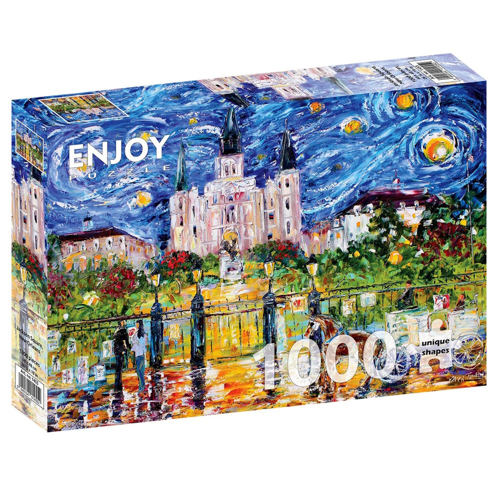 Step into the heart of New Orleans with this vibrant 1000-piece puzzle, featuring Jackson Square brought to life in bold, expressive brushstrokes. A glowing cathedral rises against a swirling starry sky, while horse-drawn carriages, lamplight, and lively street scenes capture the city’s charm and romance. A perfect challenge for puzzle lovers who appreciate art, culture, and the magic of the Crescent City.