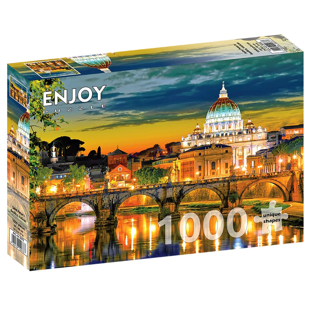 Experience the breathtaking beauty of Rome with the Saint Peter’s Basilica 1000 Piece Puzzle by Enjoy. Featuring a stunning view of the illuminated basilica at sunset, this puzzle captures the elegance of Renaissance architecture reflected in the tranquil waters of the Tiber.