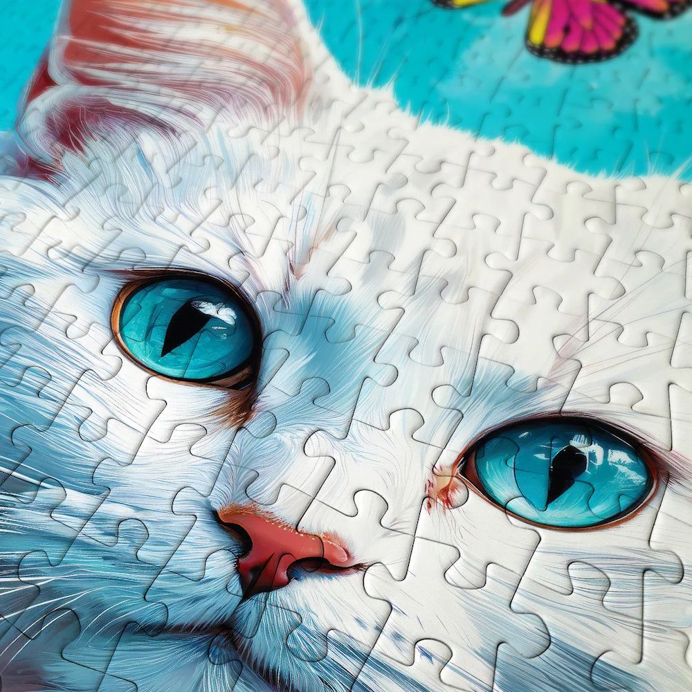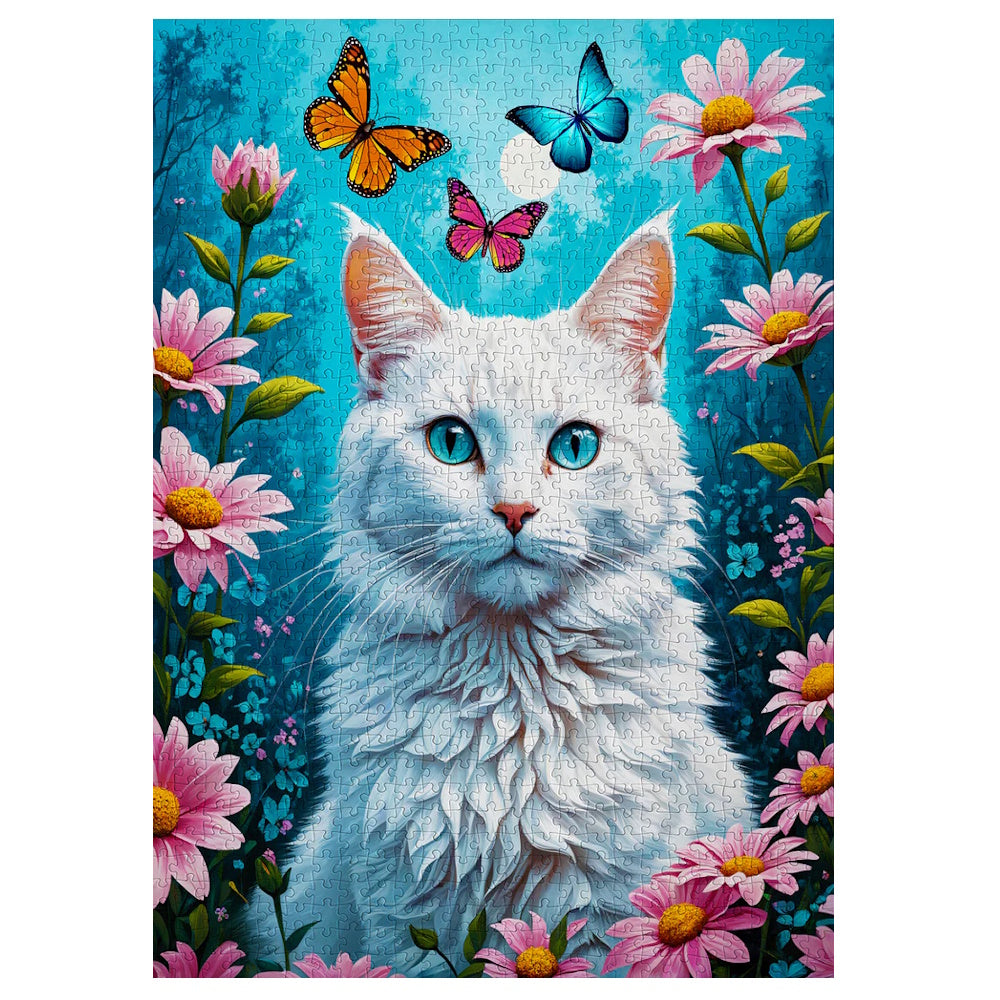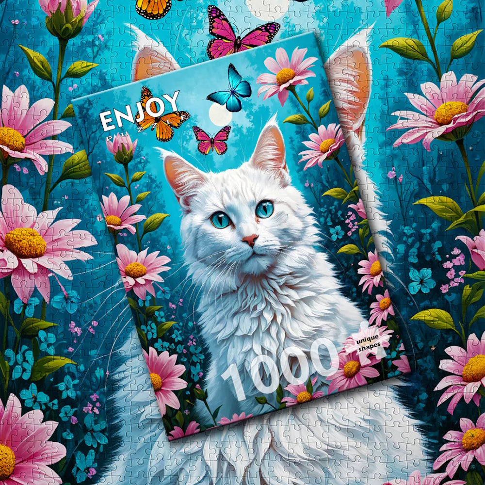 Step into a world of serenity with the Enjoy 1000 Piece Puzzle – White Cat. A striking white cat with crystal-blue eyes sits gracefully among vibrant pink flowers as butterflies flutter in the moonlit sky. This enchanting puzzle combines elegance and charm, offering a delightful challenge for cat lovers.