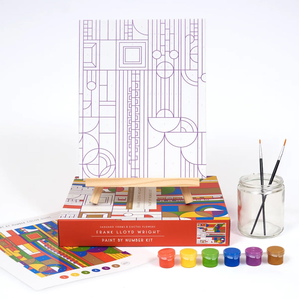 The Frank Lloyd Wright Saguaro Cactus and Forms Paint By Numbers Kit from Galison includes a line-drawing of Wright's design masterpiece. This paint by numbers piece is designed for anyone to replicate Wright's famous work.