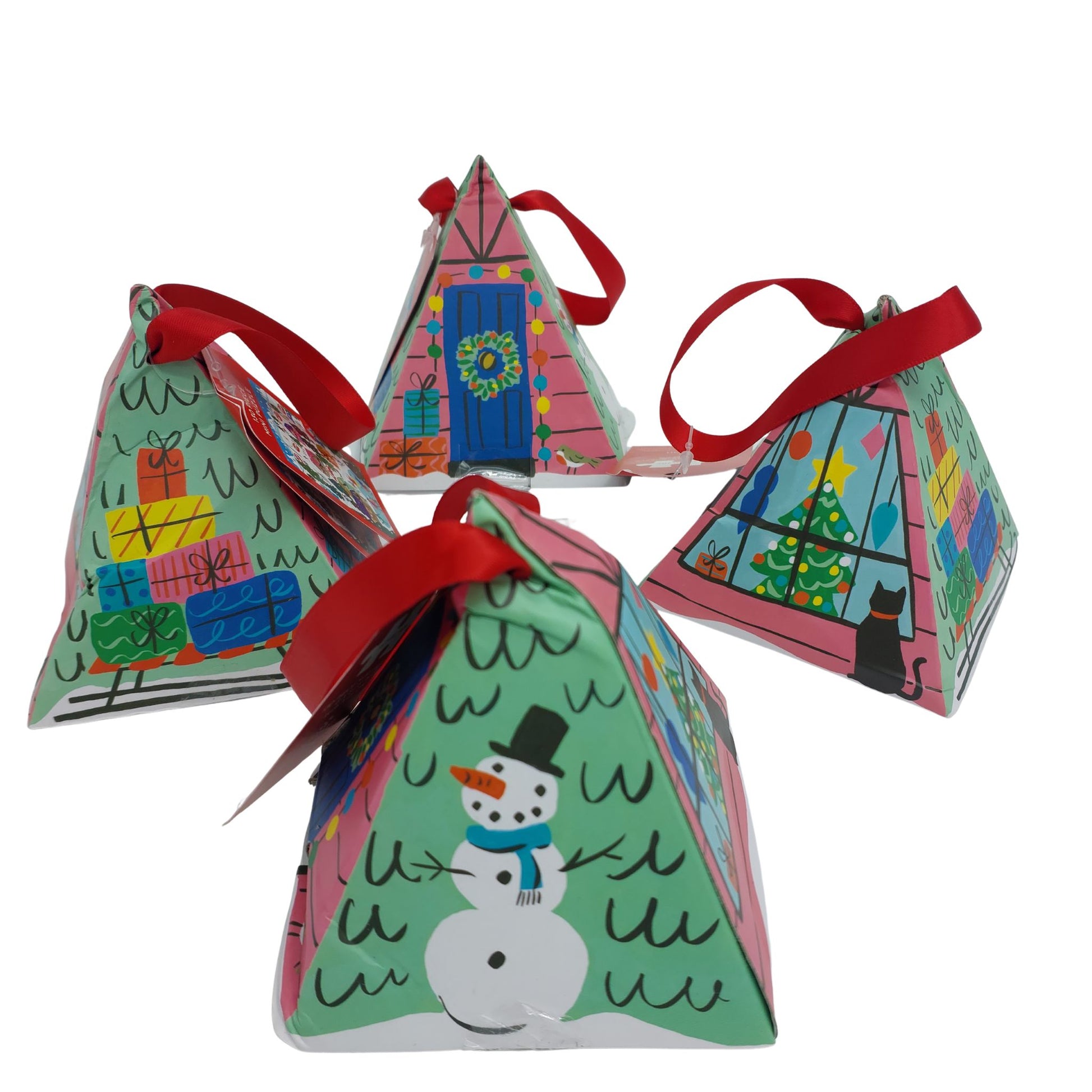 The Alpine Cottage Puzzle Ornament, featuring Louise Cunningham Starling's artwork, contains 130 pieces and showcases a miniature pyramid-shaped design adorned with Christmas Trees, ornaments, and lights in festive colors. Enjoy a charming depiction of alpine living during the winter season with this colorful mini puzzle.