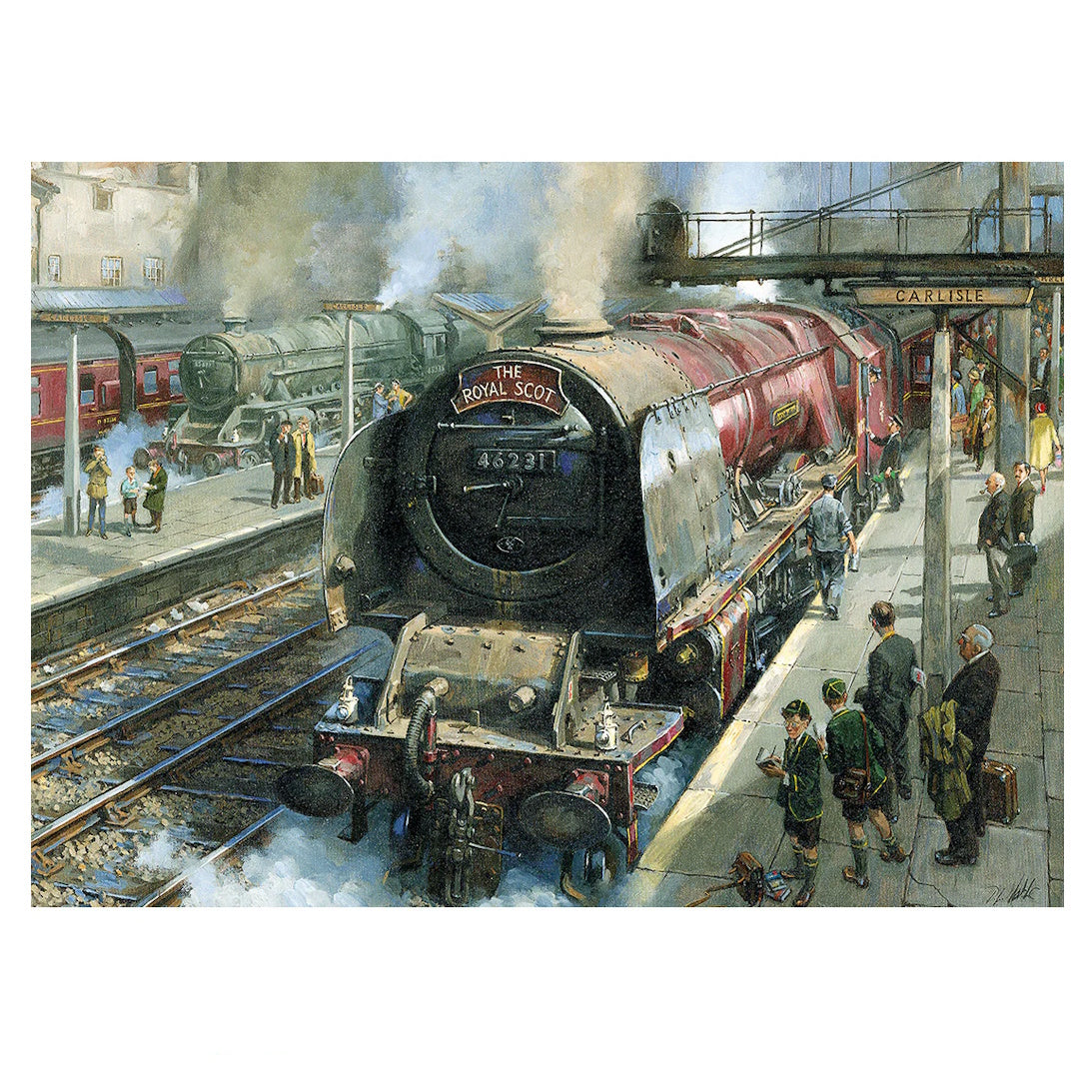 The Royal Scot steam train stands proudly in the station at Carlisle in this 1000 piece jigsaw by David Noble.