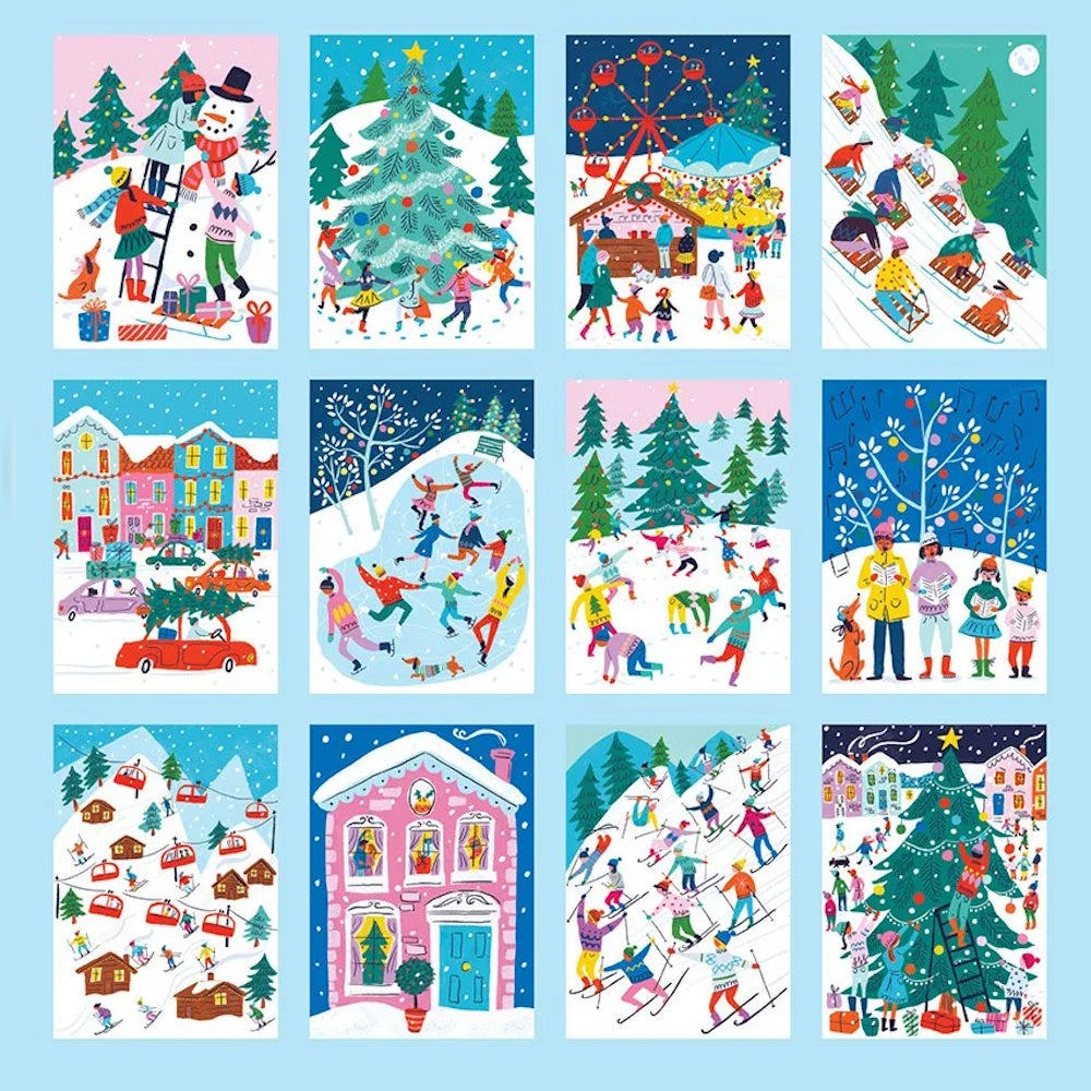 Louise Cunningham Starling's Merry and Bright 12 Days of Christmas Advent Puzzle Calendar from Galison captures the spirit of the holiday season with twelve whimsical illustrations; one each on twelve 80-piece puzzles.