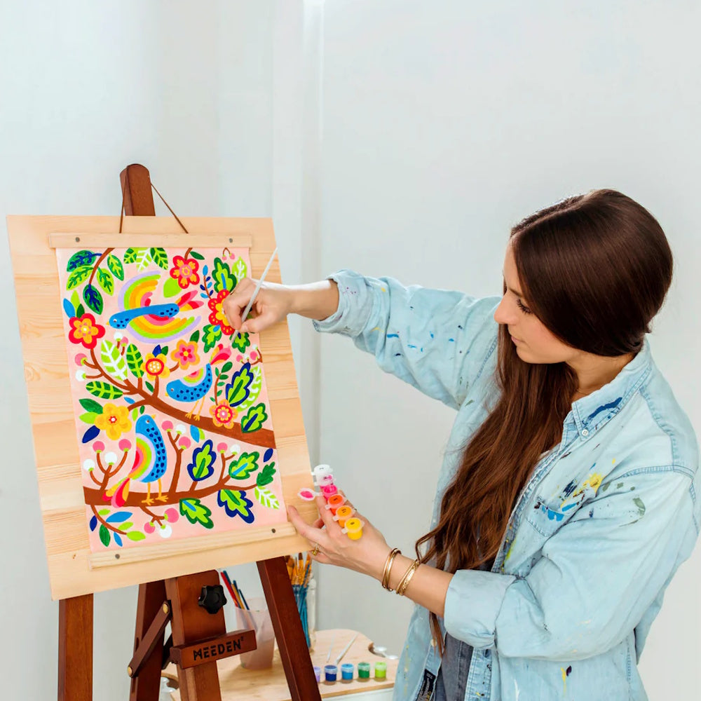 The design is a cheery picture of three birds enjoying an afternoon on colourful branches. Get a few of these paint by numbers kits and organize a paint party with friends, or treat that special someone to this canvas kit and watch as they experience the joy of painting!
