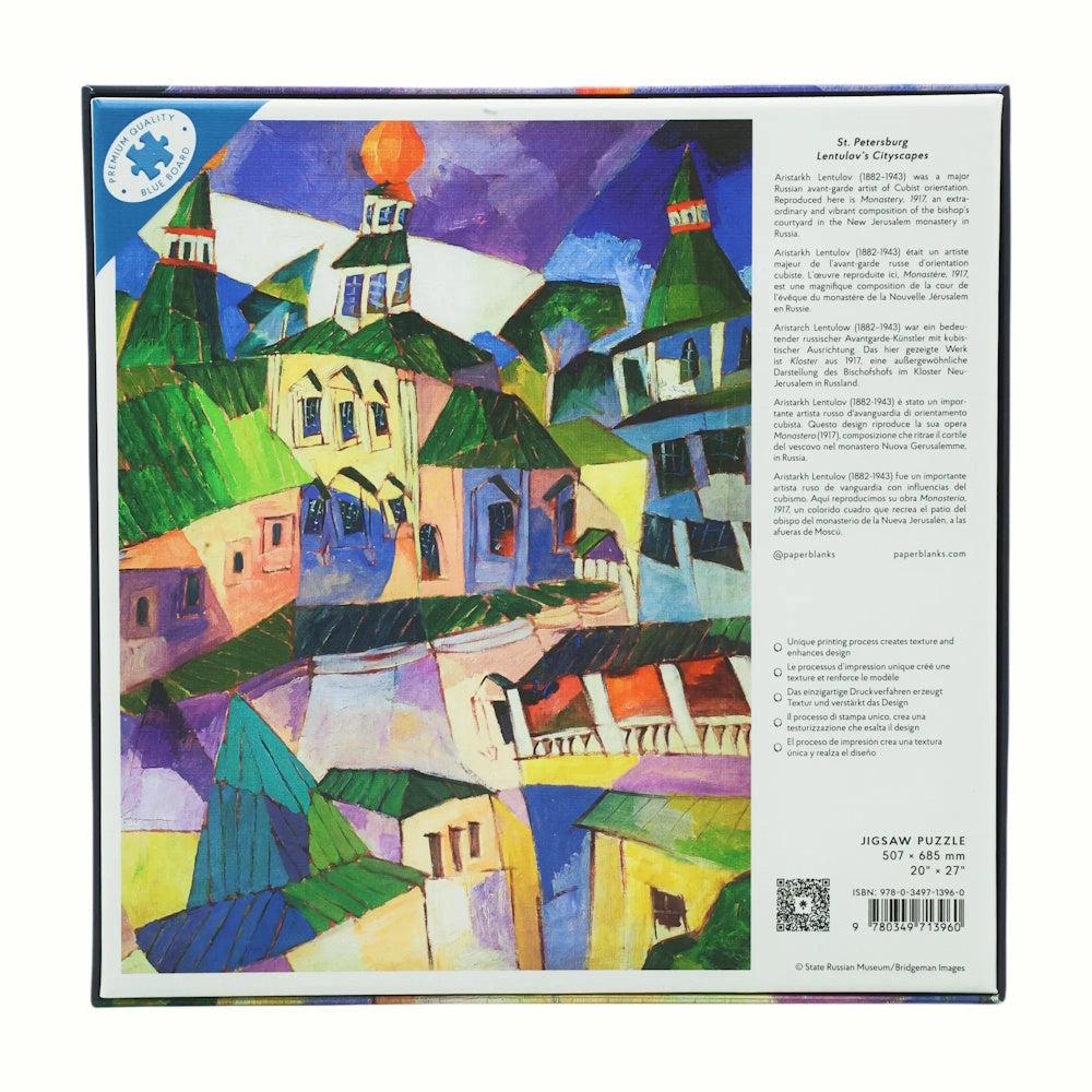 Celebrate the bold colours and energy of Russian modernism with the St. Petersburg 1000 Piece Puzzle from Paperblanks. Featuring Monastery (1917) by Aristarkh Lentulov, a leading figure of the Moscow School of Art and a pioneer of the Russian avant-garde, this striking work captures the vivid dynamism of Cubist expression.