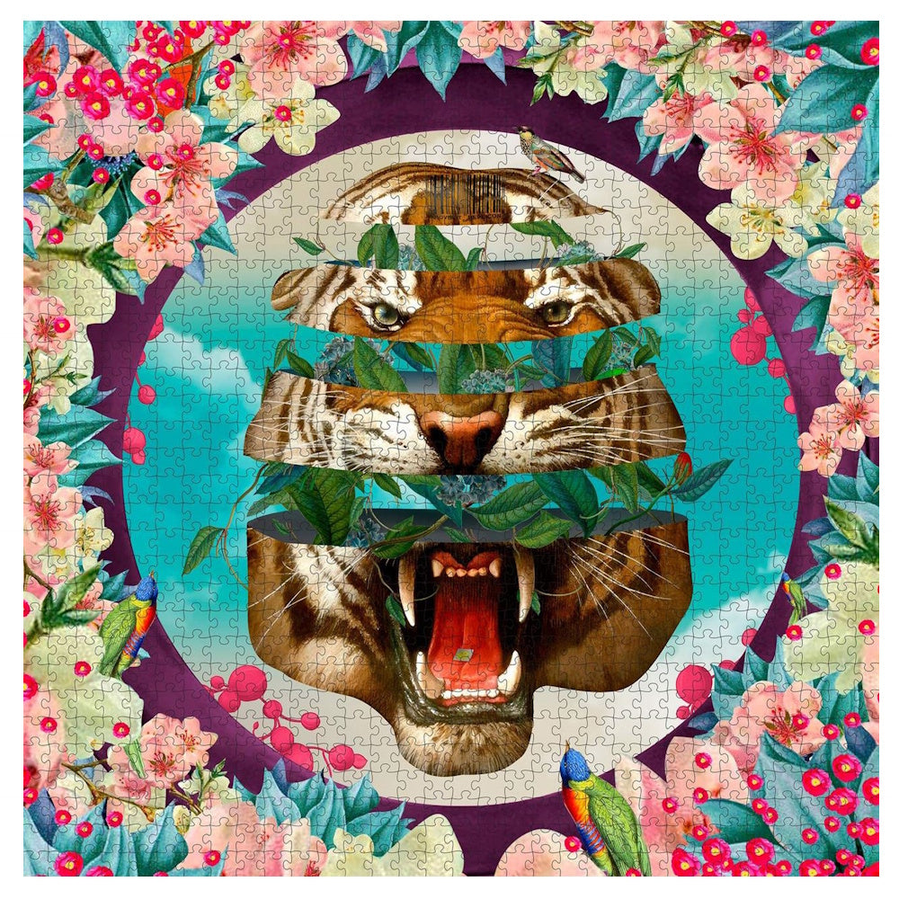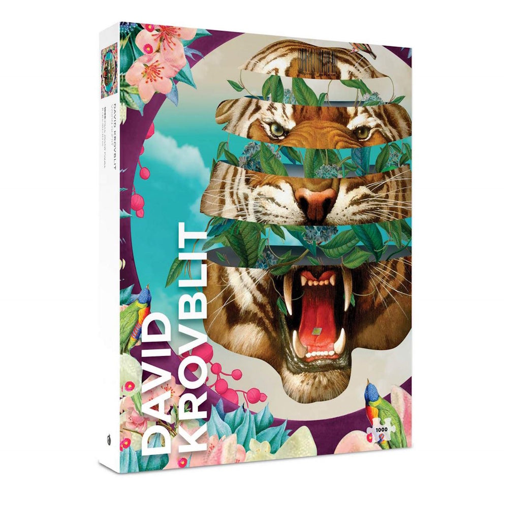 Step into the surreal world of David Krovblit with Vision Quest, a striking 1000-piece jigsaw puzzle. Bursting with vivid detail, this imaginative collage layers a roaring tiger, lush foliage, delicate blossoms, and jewel-toned birds in a dreamlike fusion of nature and power.