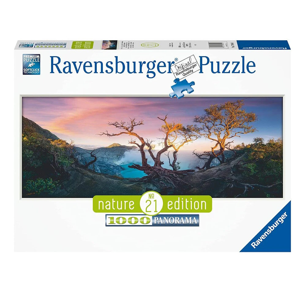 Embark on an exotic adventure with the Ravensburger 1,000-piece jigsaw puzzle "Acid Lake at Mount Ijen, Java." This stunning puzzle captures the breathtaking view of the turquoise acid lake nestled within the crater of Mount Ijen, surrounded by rugged volcanic landscapes.