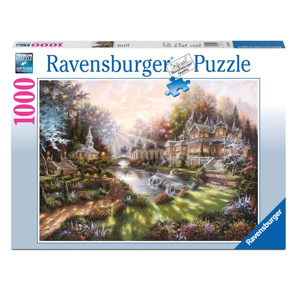 Immerse yourself in the tranquil beauty of dawn with the Ravensburger 1,000-piece jigsaw puzzle "Morning Glory." This captivating puzzle captures the essence of a serene morning, featuring a stately home surrounded by meticulously manicured gardens, bathed in the soft, dappled light filtering through the trees.