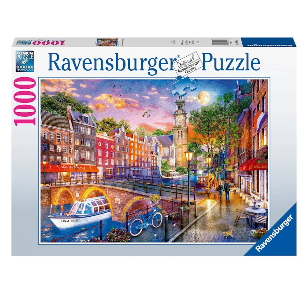 Experience the romance and charm of the Dutch capital with the Ravensburger 1,000-piece jigsaw puzzle "Sunset in Amsterdam."