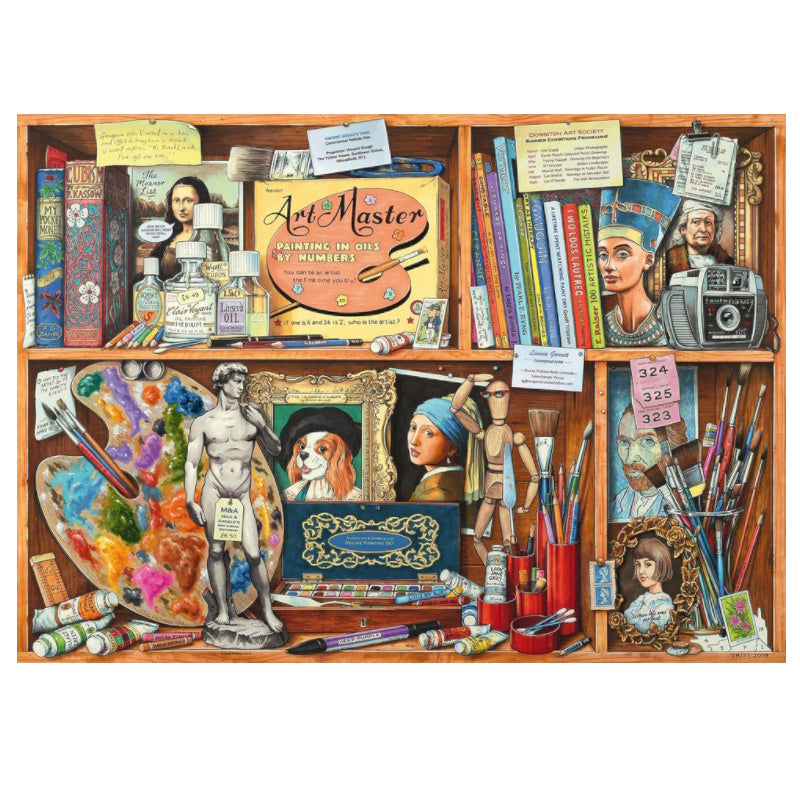 Some of us cannot resist peeping inside other people's cupboards. In this 1000 piece puzzle you can do it without any guilt! Look closely at this colourful cabinet and you may think the artist is playing a joke on you. Are there really paints called Mellow Yellow and Lady Jane Grey? And did E Raiser genuinely write the book of "100 Artistic Mistakes"?