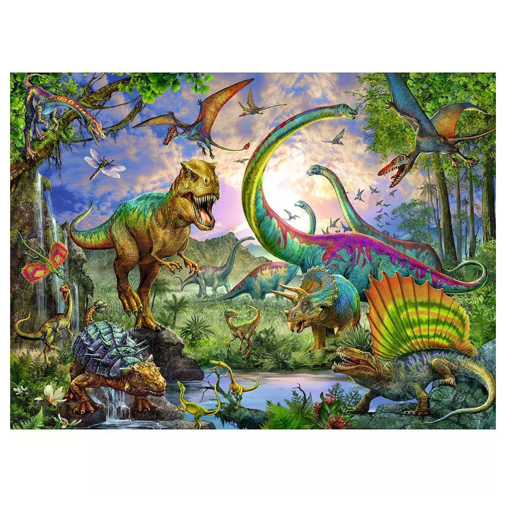 Discover the age of the dinosaurs on this colourful and detailed 200 piece jigsaw puzzle from Ravensburger. A group of these amazing creatures gather around a pond. Some are quiet, just enjoying a drink, but the T-Rex looks like he's going to shatter the calm, and trouble could be in store. There are lots of favourite dinosaurs just waiting to be discovered as you piece together the puzzle.