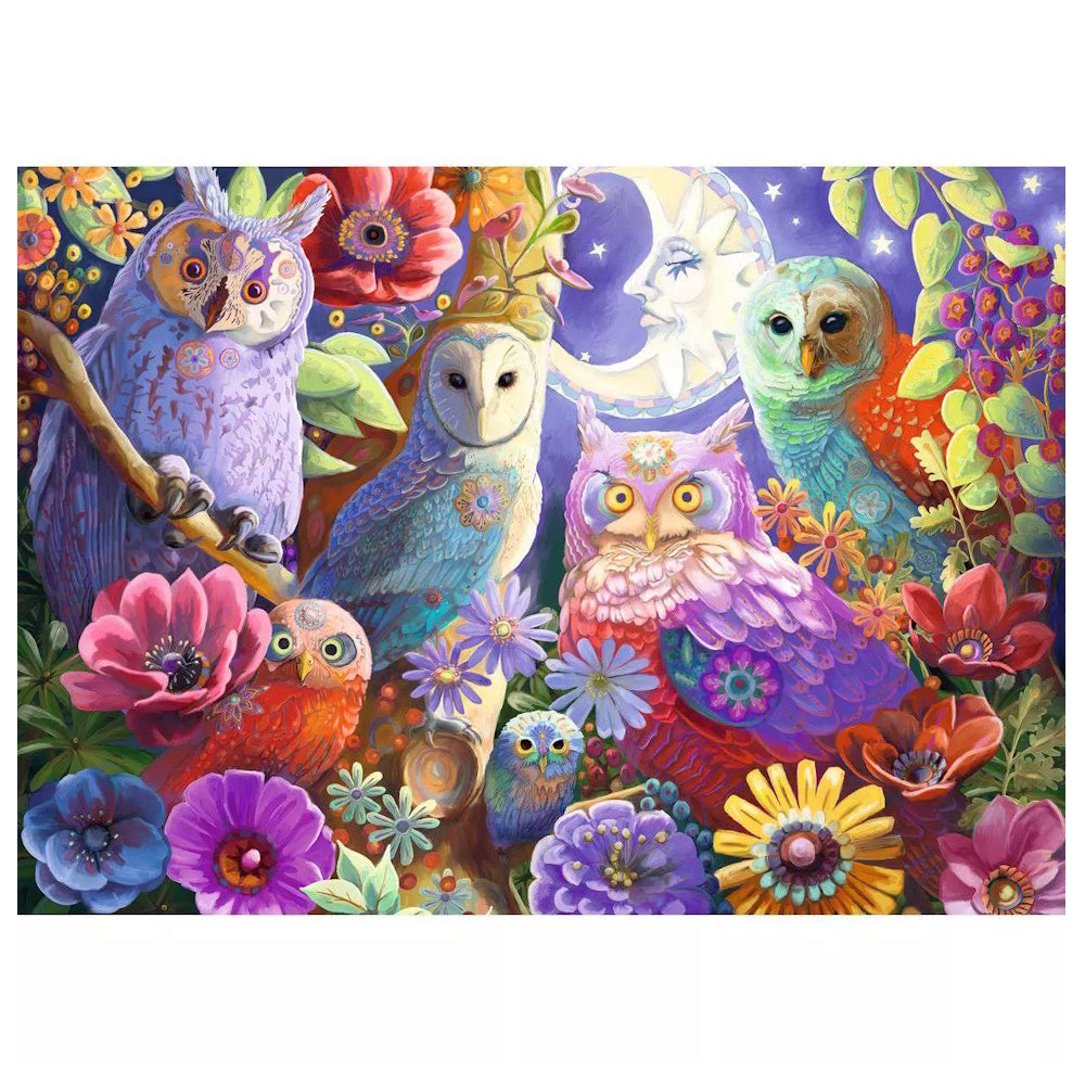 Brighten your puzzle time with Ravensburger’s 300-Piece Large Format Puzzle "Night Owl Hoot." This whimsical scene features a colourful parliament of owls under a moonlit sky, surrounded by vivid blooms and dreamy details.