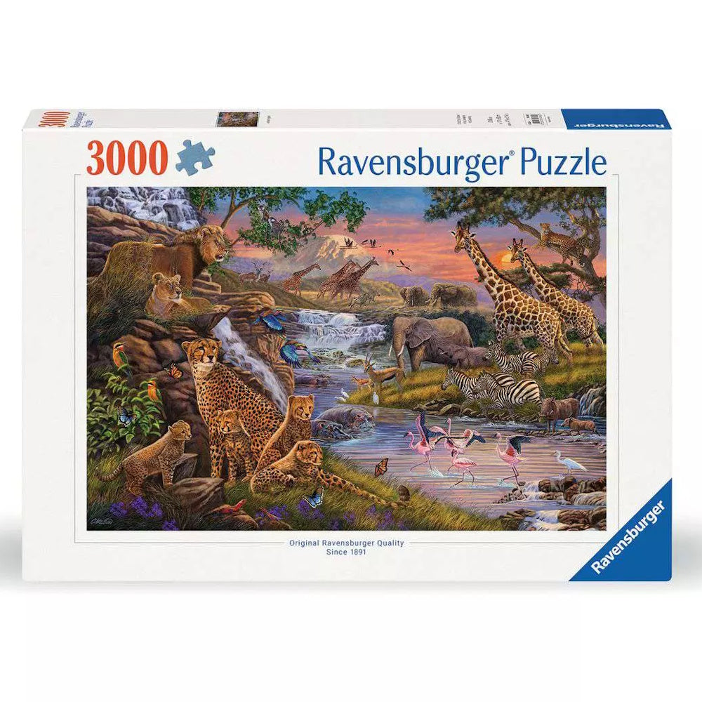 Step into the heart of the savannah with “Animal Kingdom,” a breathtaking 3000-piece puzzle teeming with wildlife. From majestic lions and graceful giraffes to vibrant birds and playful cheetah cubs, this stunning scene captures the rich biodiversity of Africa at sunset. A captivating challenge for nature lovers and puzzle pros alike!
