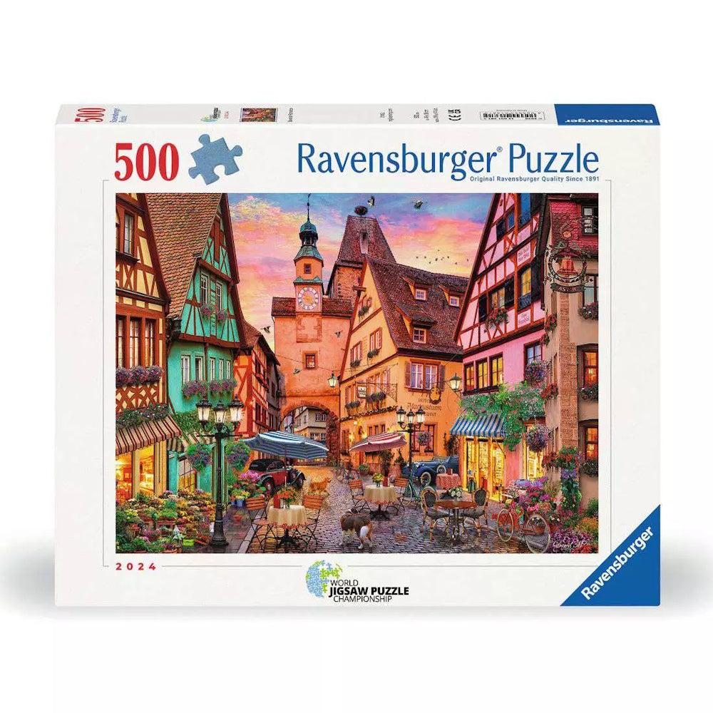 Escape to the heart of Europe with Ravensburger’s 500 Piece Puzzle "Bavarian Romance." This enchanting scene captures the timeless beauty of a traditional German town at sunset, with its colourful timber-framed houses, cobblestone streets, flower-filled windows, and cosy cafés. Brimming with old-world charm and romantic atmosphere, this puzzle offers a delightful challenge and a picturesque reward for anyone who dreams of European wanderings.