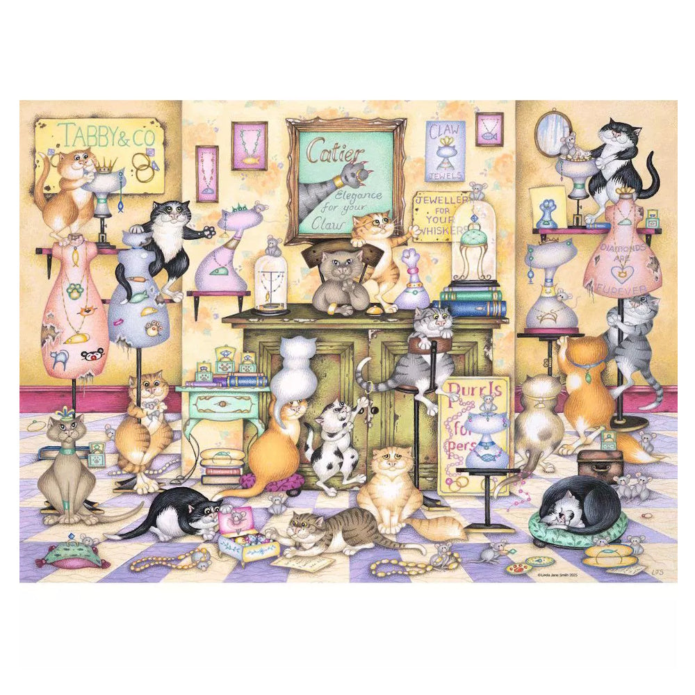 Embark on an eccentric journey with this 500-piece jigsaw puzzle, in a riotous tableau of crazy cats, enigmatic mannequins, dazzling jewelry, and mischievous mice. Each piece is a fragment of this whimsical world, inviting you to lose yourself in the intricate details and vibrant colours. Puzzle number 17 in the Crazy Cats Vintage Series by Linda Jane Smith.
