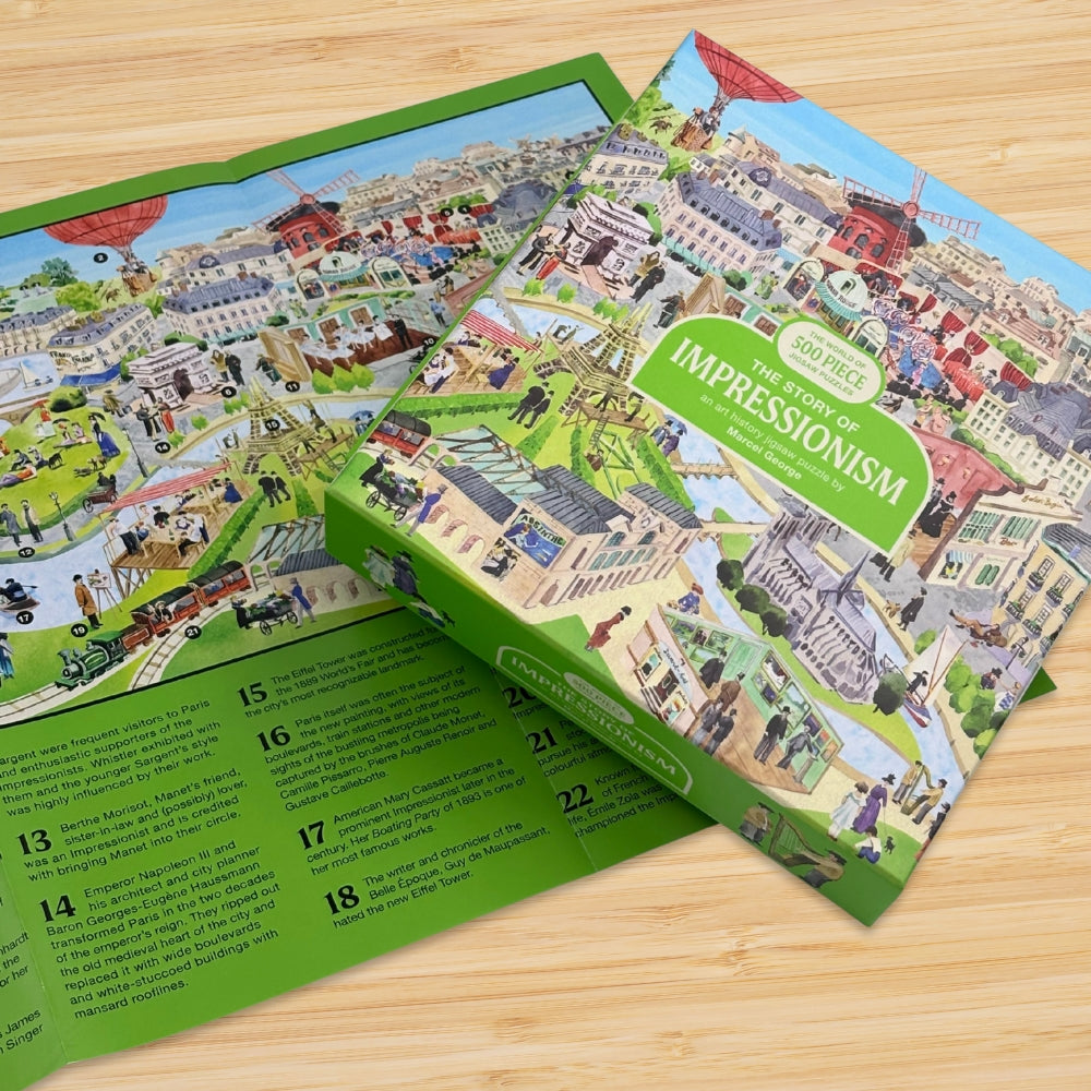 - Includes a fold-out poster with puzzle image on one side, and guide to the artists/locations on the other