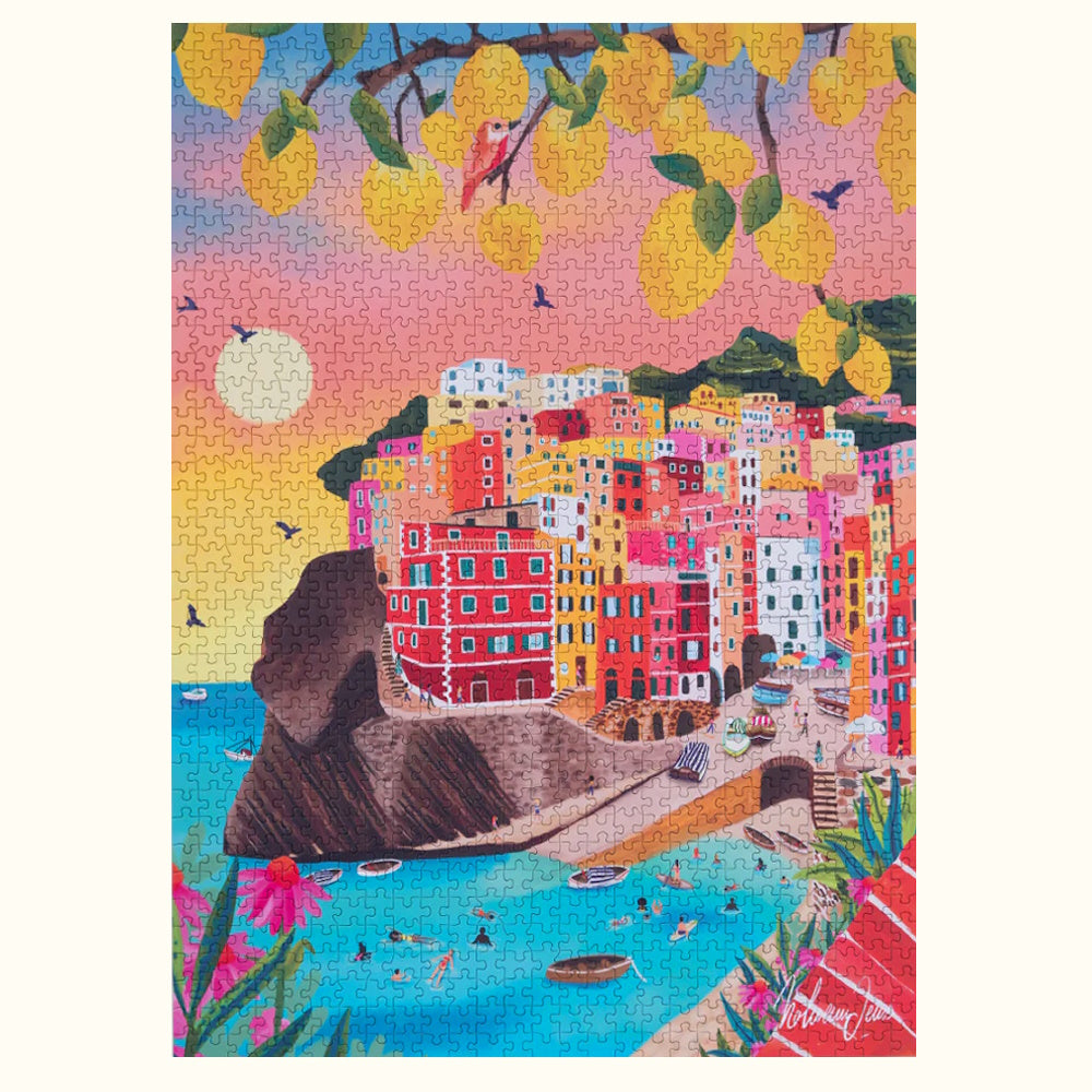 Explore the beauty of Italy's coastline with Werkshoppe's 1000-piece puzzle, "Cinque Terre," featuring a vibrant painting by French artist Nolwenn Denis.